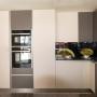 Eine Küche im modernen grifflosen Design in den Farben Sand / Lava mit Geräten in Edelstahl und Granitarbeitsplatten in "Coffee Imperial".