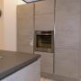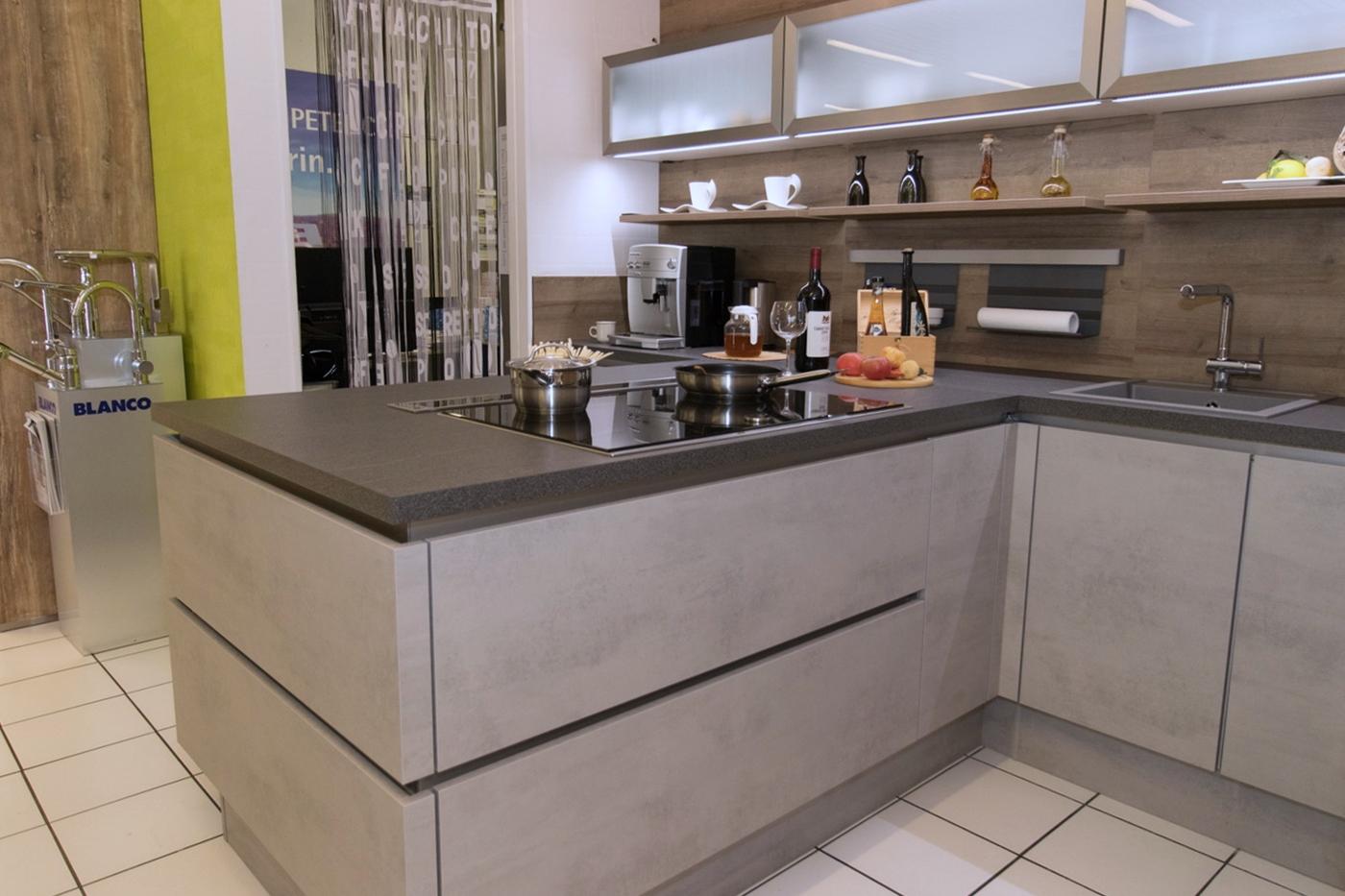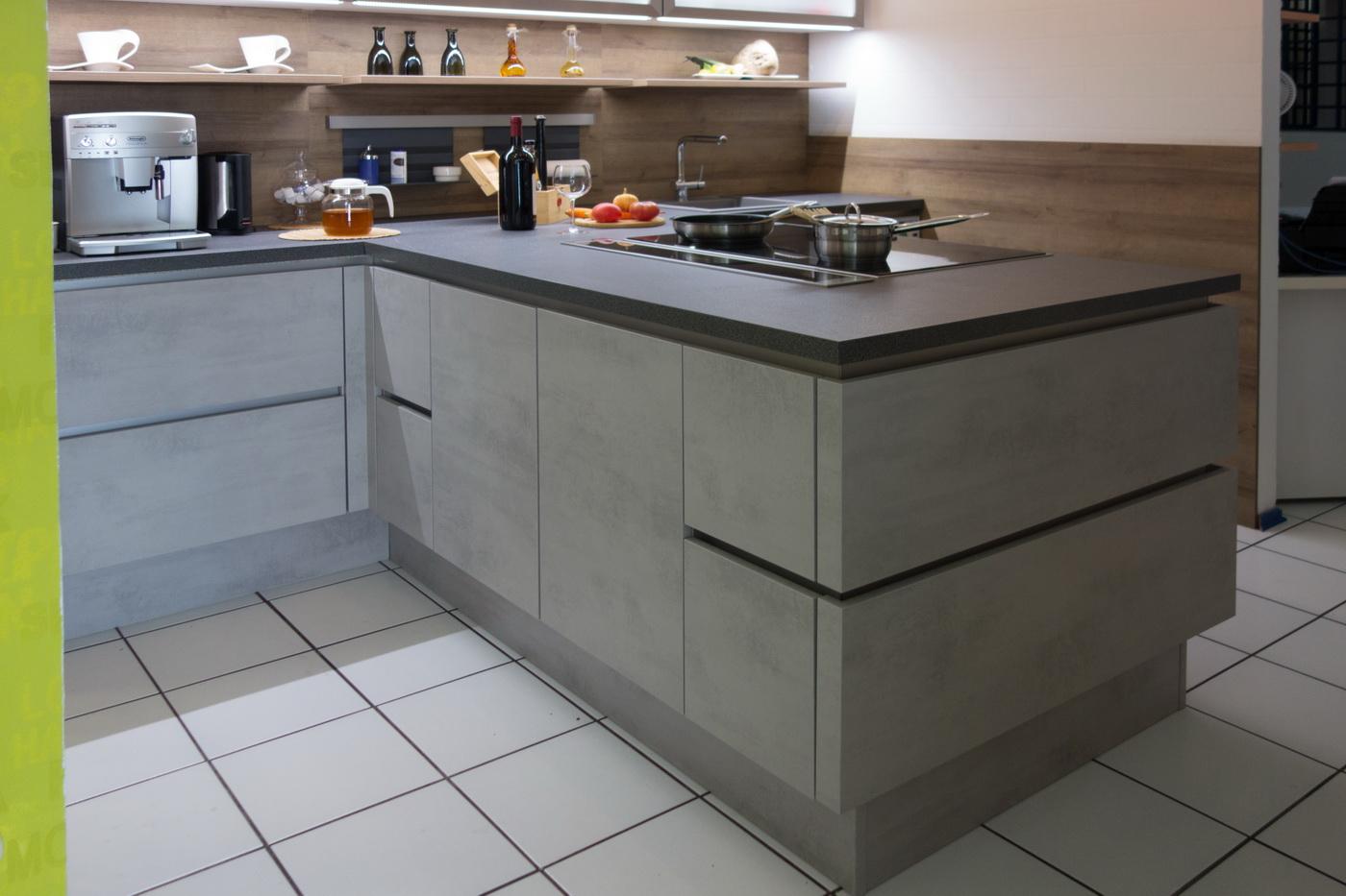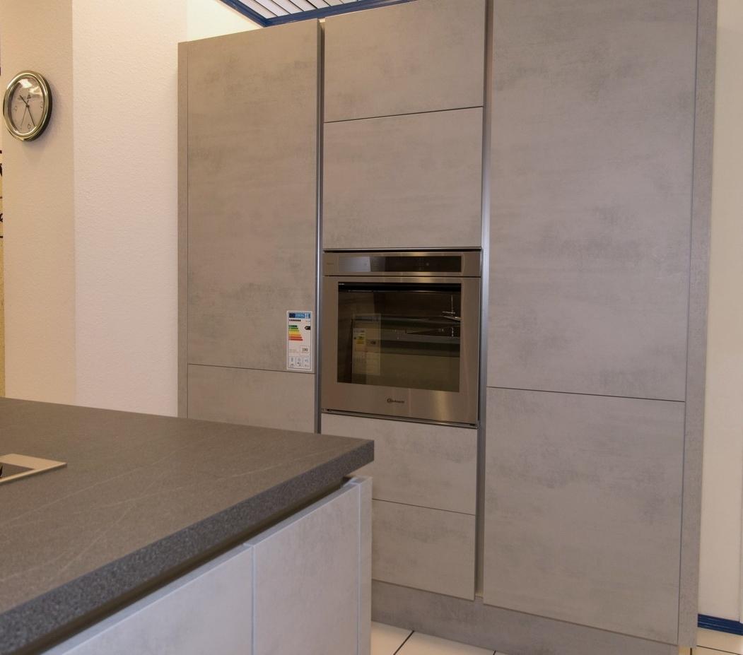 Eine moderne grifflose Küche mit klaren Linien und edlem Design in Betonoptik, Eiche Ontario und Arbeitsplattenfarbe Granit Torreano